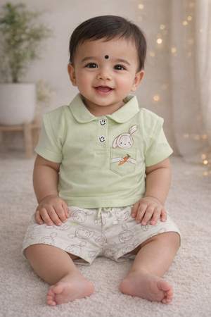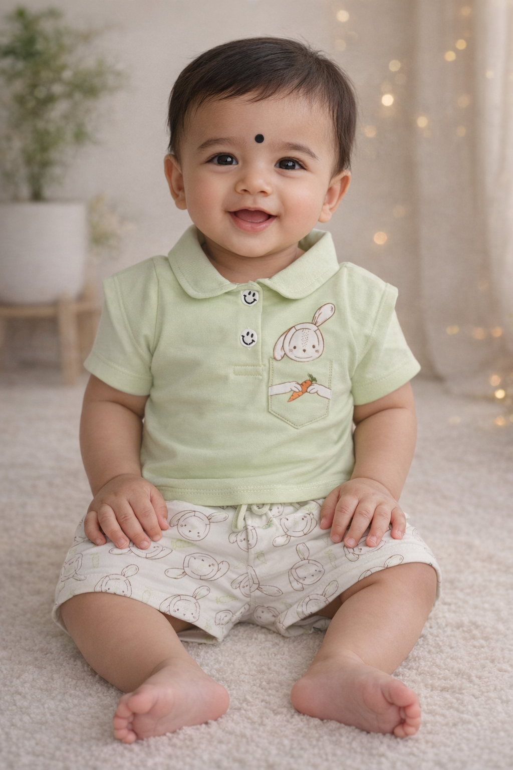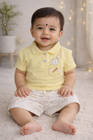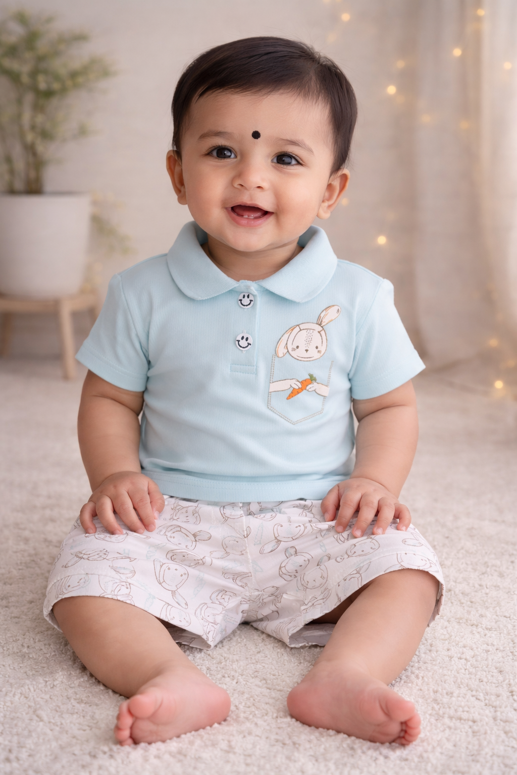 Dress your little one in comfort and cuteness with this charming babywear set, designed for everyday play and special moments alike. The set features a soft polo-style T-shirt paired with matching shorts, finished with a playful bunny print that adds a fun and cheerful touch.