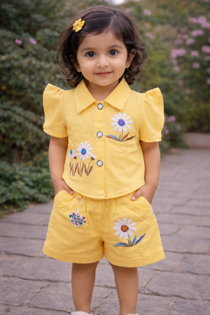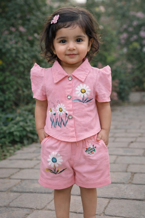 A charming and comfortable co-ord set designed for everyday play and special outings. This two-piece outfit features a collared button-up top paired with matching shorts, highlighted by delicate floral prints that add a cheerful and playful touch. Crafted from soft, breathable fabric, it ensures all-day comfort while allowing easy movement for active little ones.