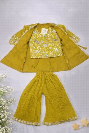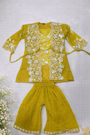 Celebrate tradition with comfort and charm. This beautifully crafted 3-piece ethnic set features rich embroidery and a festive silhouette, designed especially for toddlers and young girls. The elegant jacket-style kurta layered over a matching inner top and paired with comfortable palazzo pants makes this outfit perfect for special occasions.