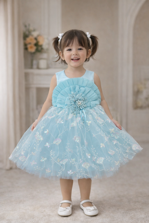 Featuring a beautifully structured bodice with a statement floral centerpiece, this dress flows into a soft, layered tulle skirt adorned with subtle embroidered detailing that adds a touch of sparkle and charm. The lightweight fabric allows easy movement while keeping your little one comfortable throughout the day.