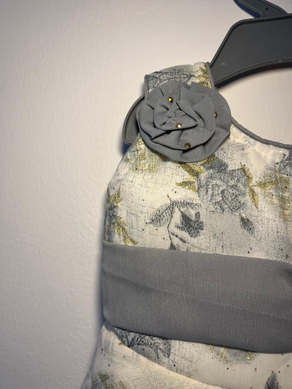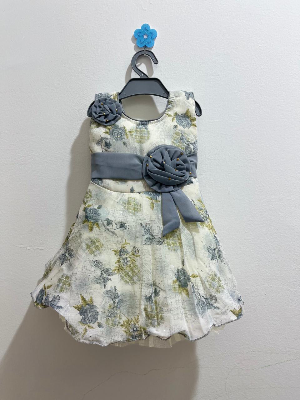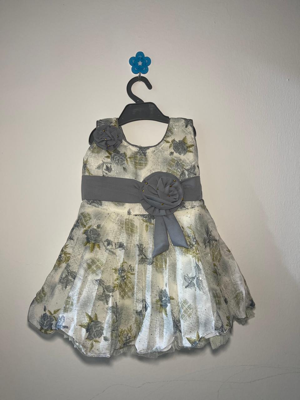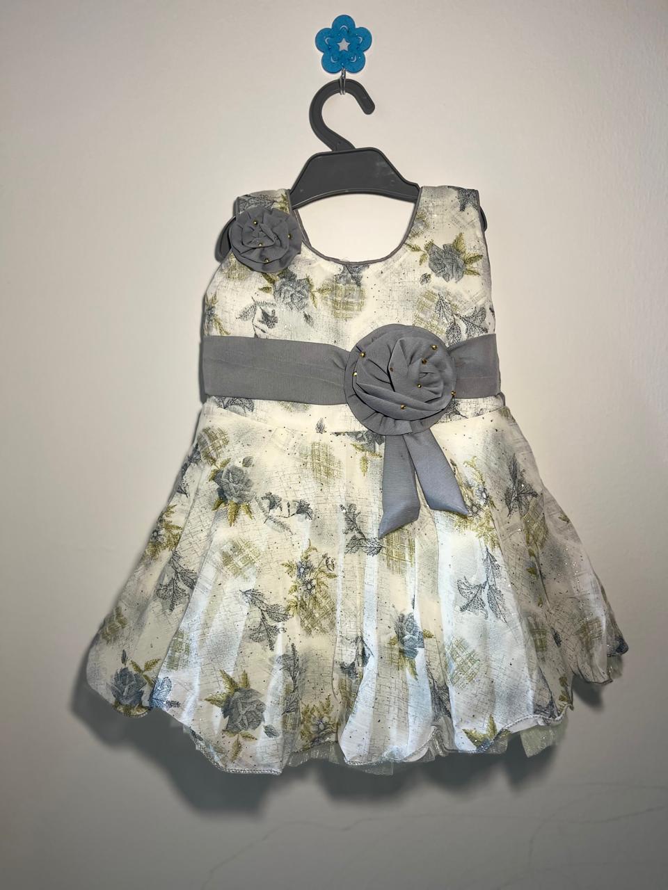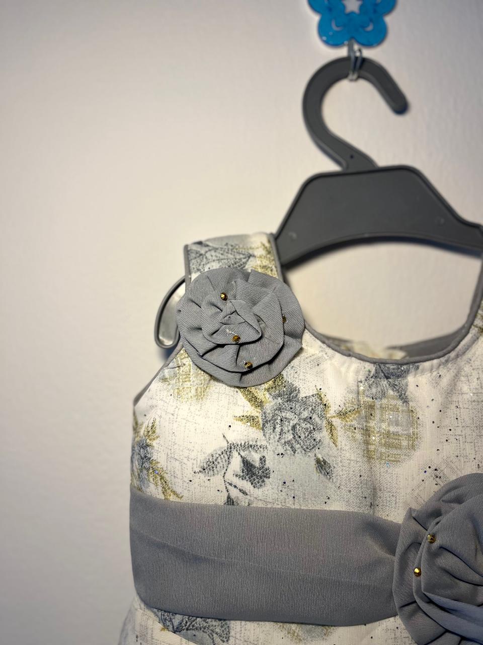 Crafted with a soft cream base and subtle floral patterns, this dress features a graceful flared silhouette that allows easy movement for your little one. The standout handcrafted grey fabric rosettes with delicate bead accents add a premium touch, making it ideal for festive occasions, birthday parties, weddings, and family gatherings.